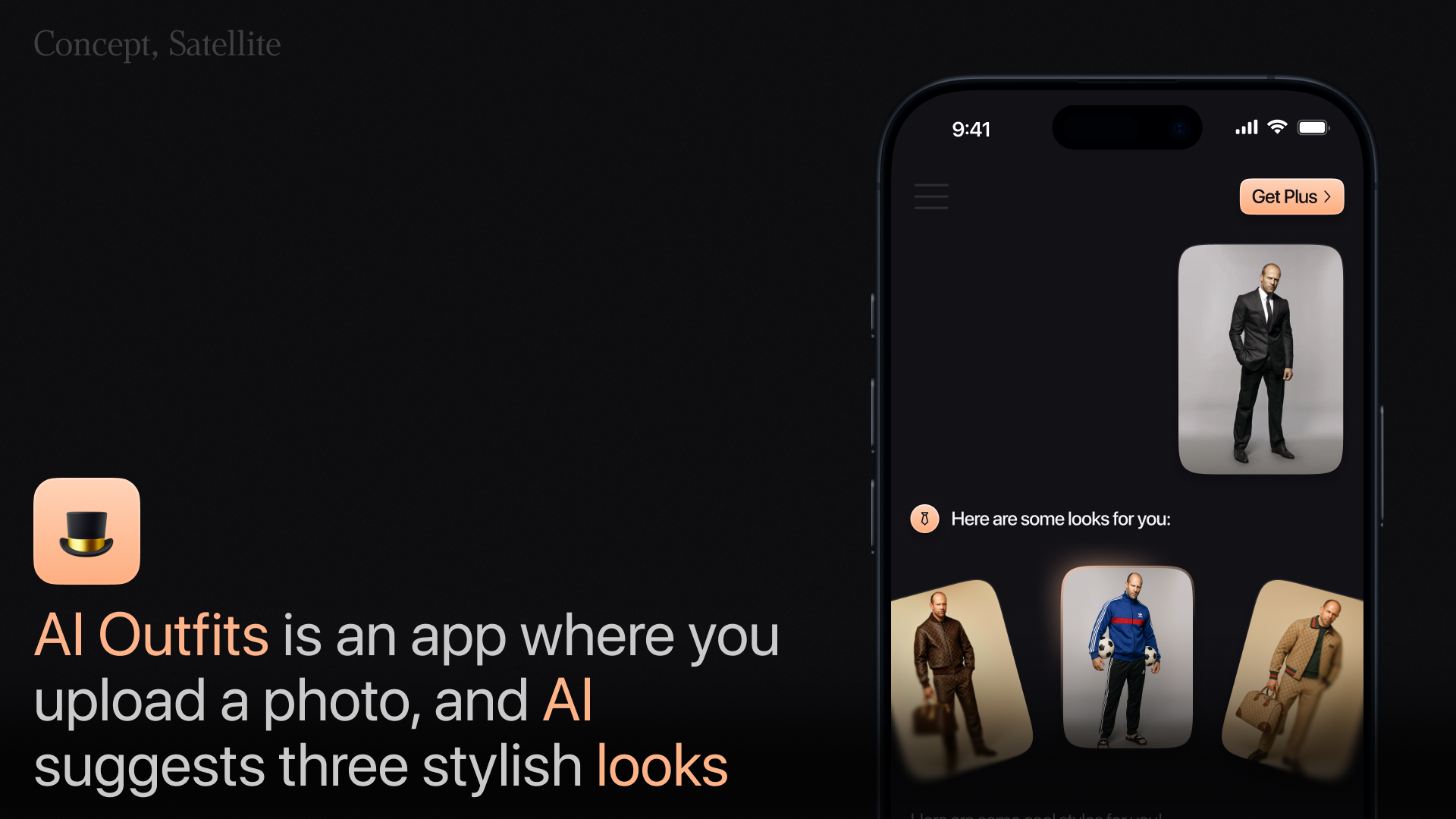 AI Outfits is an app where you upload a photo, and AI suggests three stylish looks. Preview of looks, recommendations, and mini style icons.