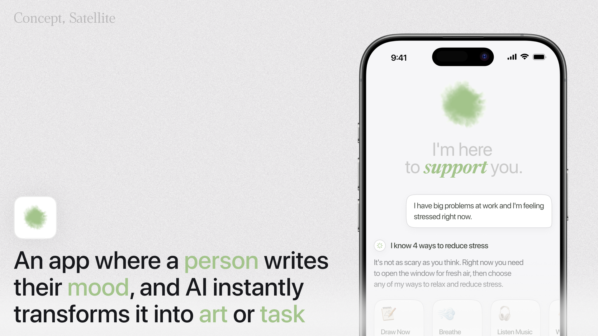 An app where a person writes their mood, and AI instantly transforms it into art, animation, or supportive text with explanations.