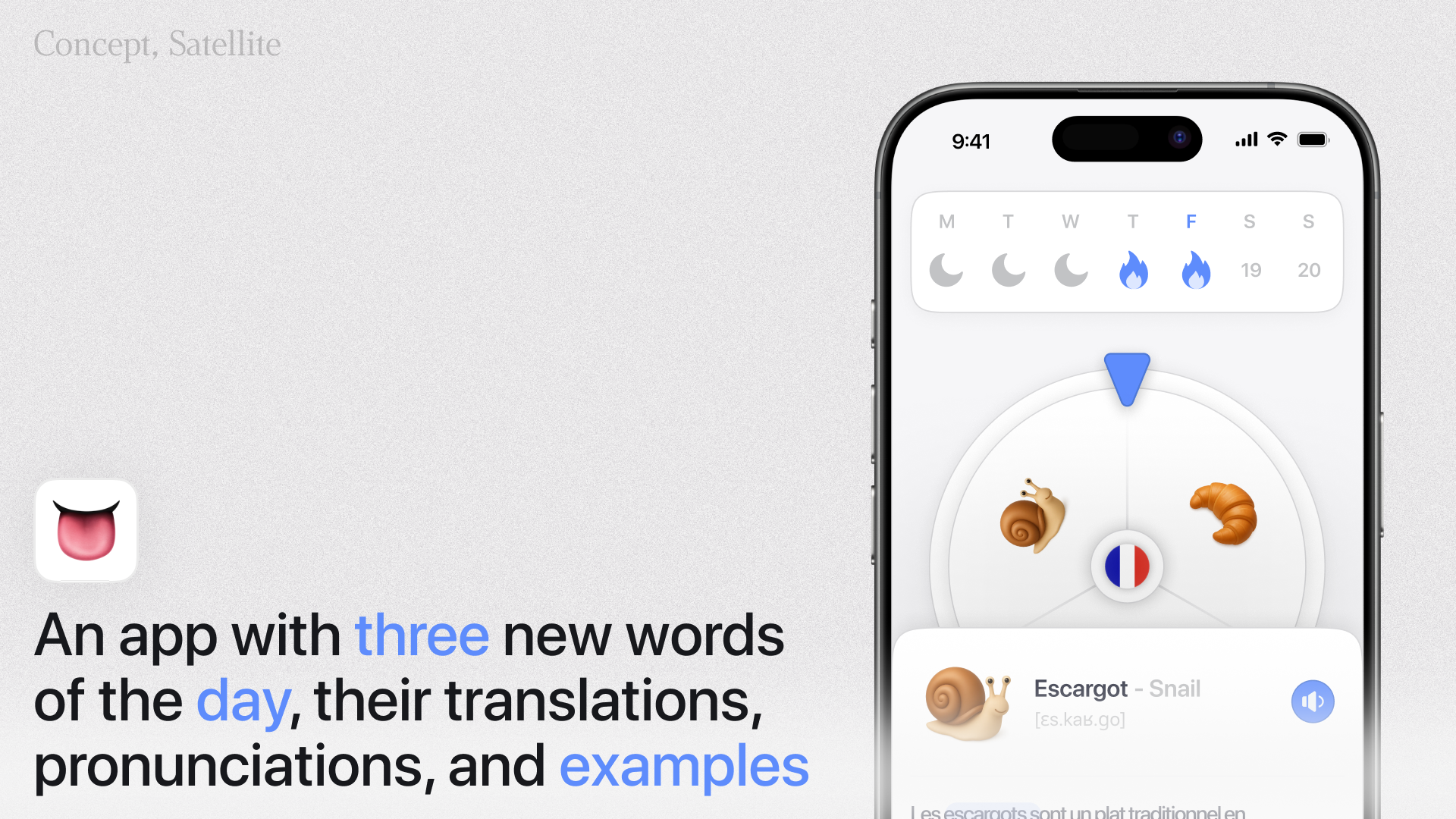An app with three new words of the day, their translations, pronunciations, and examples. Illustrations to make learning fun.