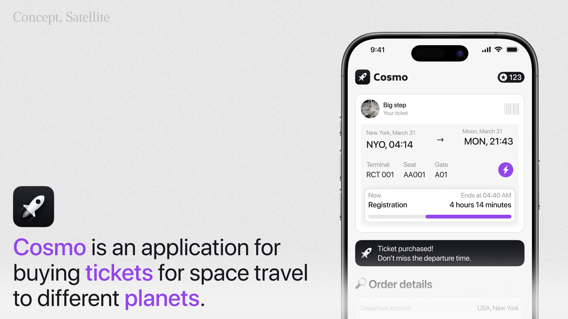 Cosmo is an application for buying tickets for space travel to different planets. Book a trip, customize it to your heart's content, and keep an eye on it.