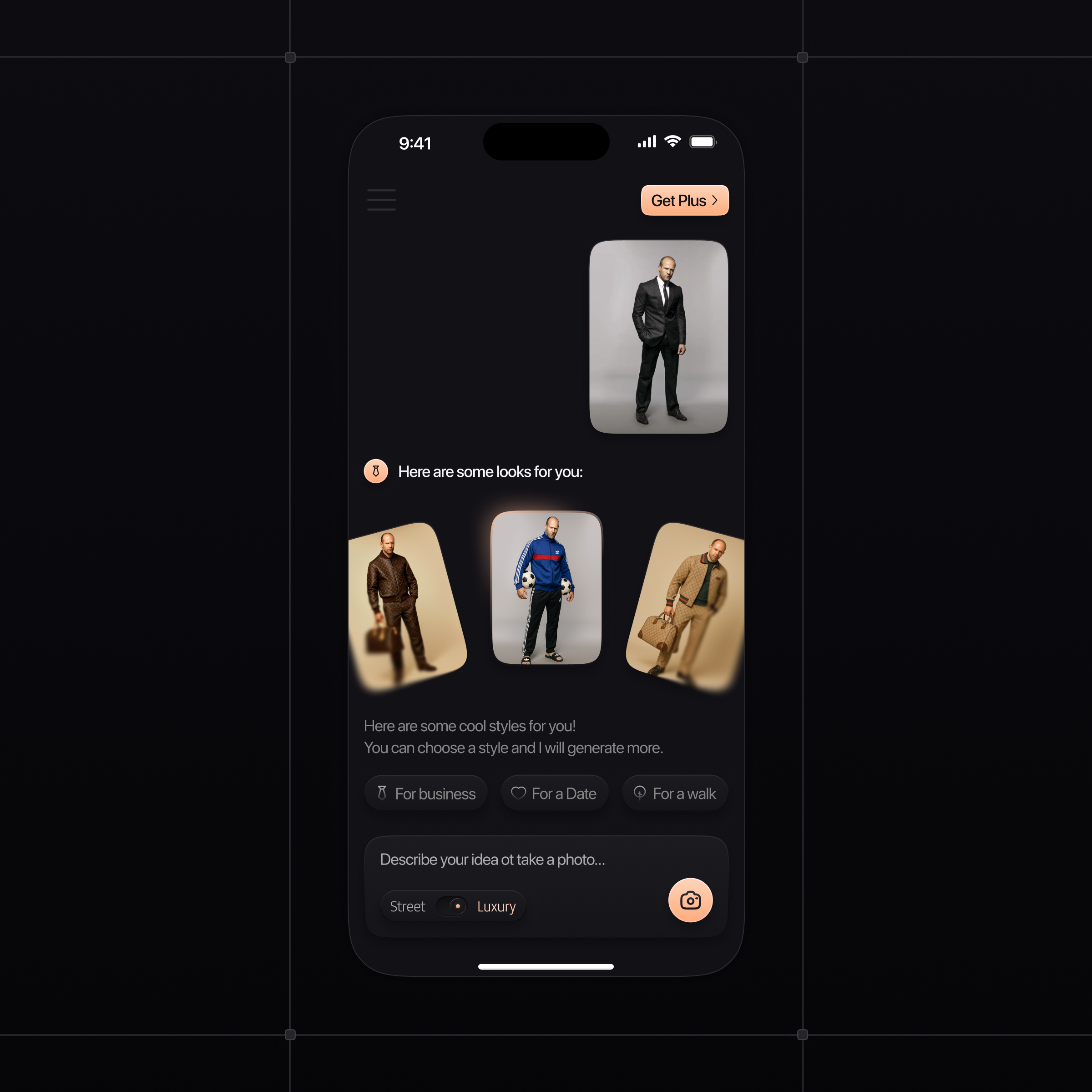 AI Outfits is an app where you upload a photo, and AI suggests three stylish looks. Preview of looks, recommendations, and mini style icons.
