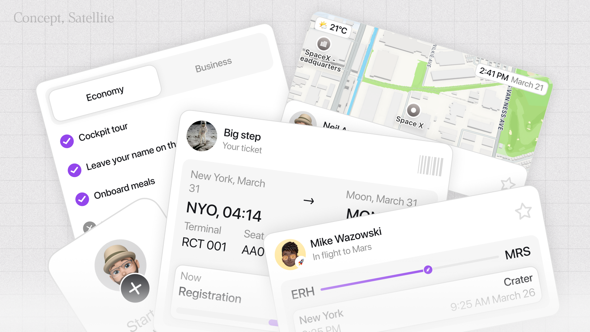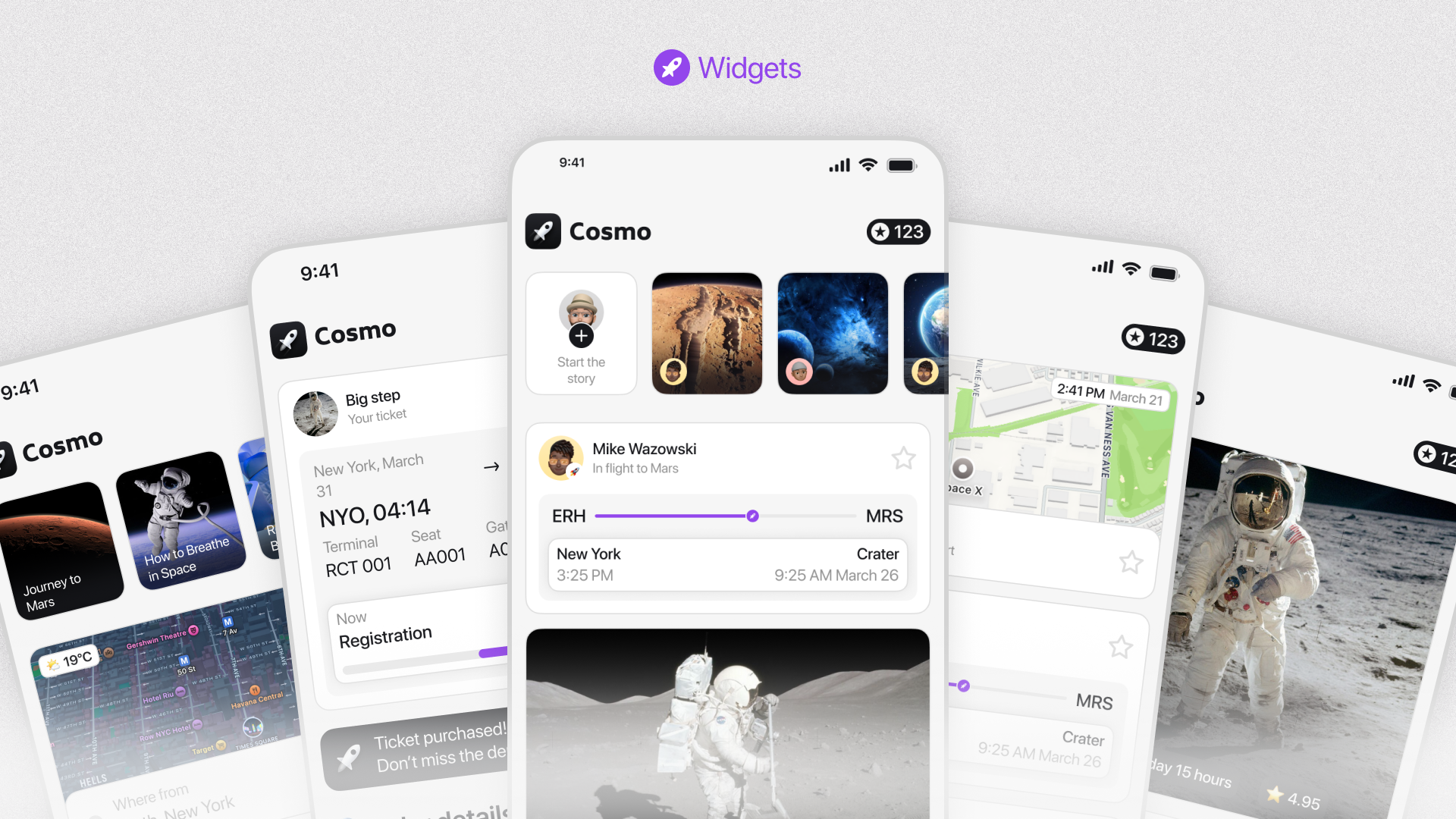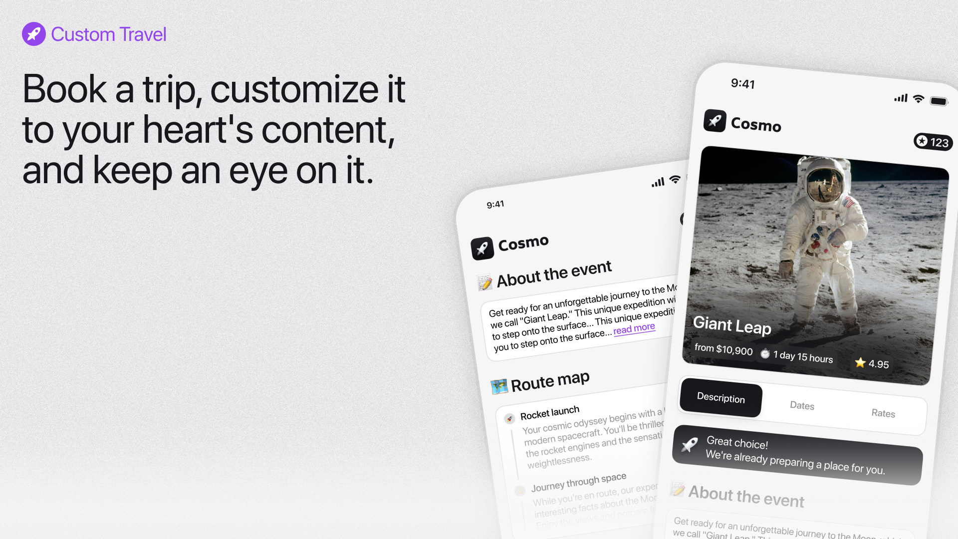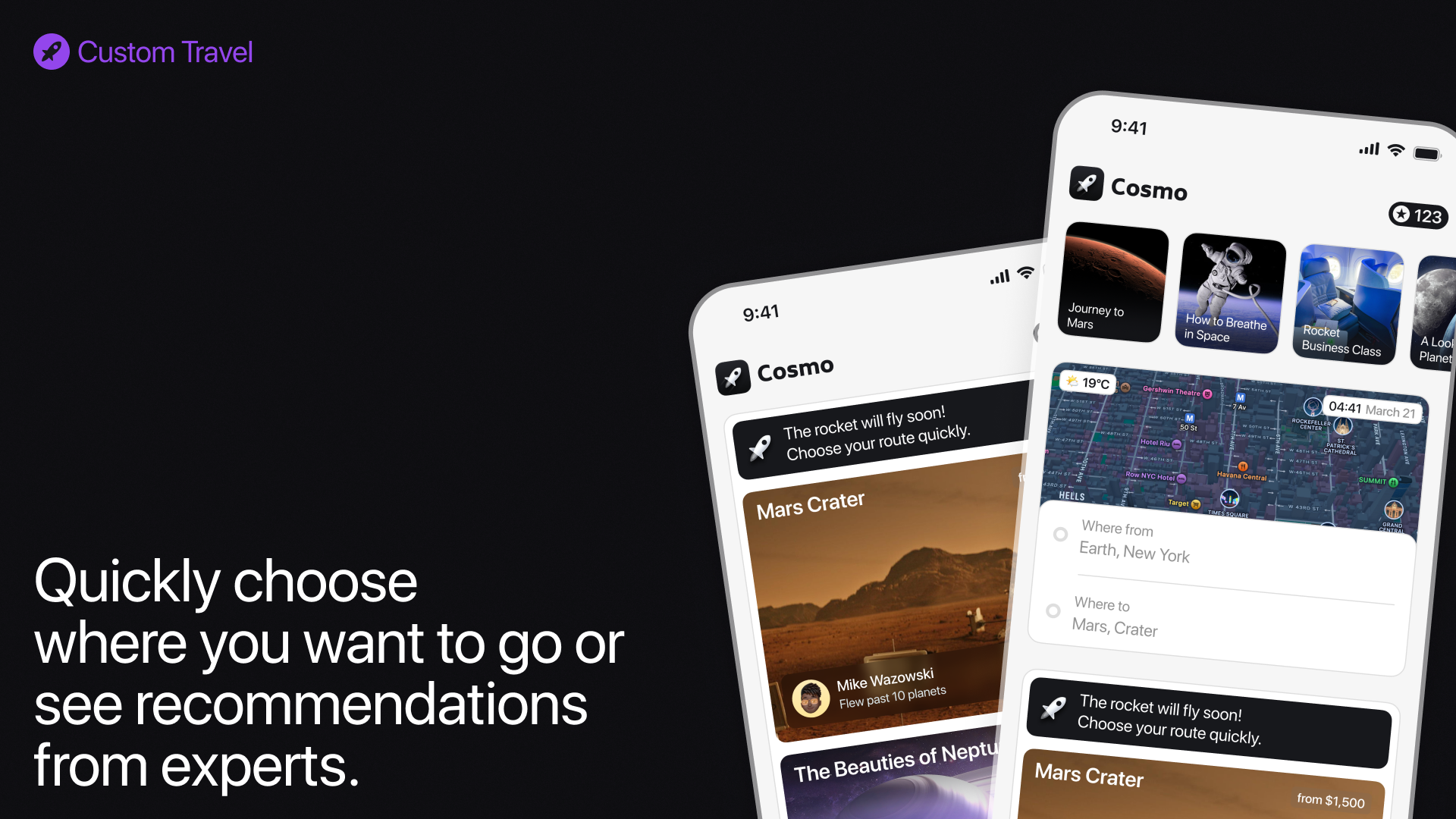 Cosmo is an application for buying tickets for space travel to different planets. Book a trip, customize it to your heart's content, and keep an eye on it.